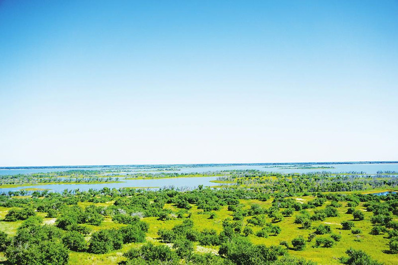 利用洮儿河、霍林河洪水资源,依托“引洮分洪入向”工程,连接向海周边48个湖泡而形成的向海生态板块,草原、湖泊、沼泽、榆林、灌丛交错,多种生物类型互相渗透,形成向海特有的生态自然景观。